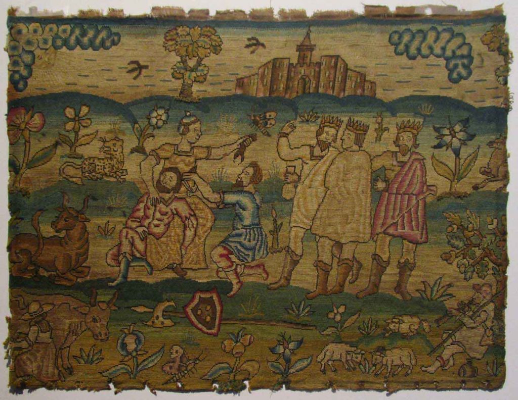 A late Stuart petit point picture (circa 1650-1690) depicting the story of Samson and Delilah. Here Delilah has removed Samson’s hair which was supposedly the source of his great strength. Curiously this rather violent scene is surrounded by a contented cow being milked by a milkmaid, a bull, three sheep, and a shepherd playing his…