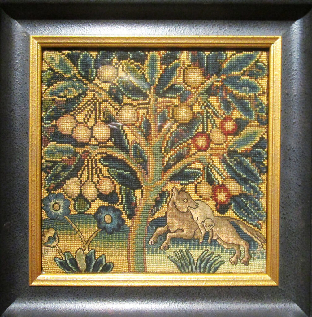Executed in gros and petit point stitches with fine wool and silk threads, this needlework vignette illustrates one of Aesop’s fables. It has been conservation mounted in a new frame. It is in excellent condition. The panel itself measures 9-1/2″ square, with the frame it is 13-1/2″ square.