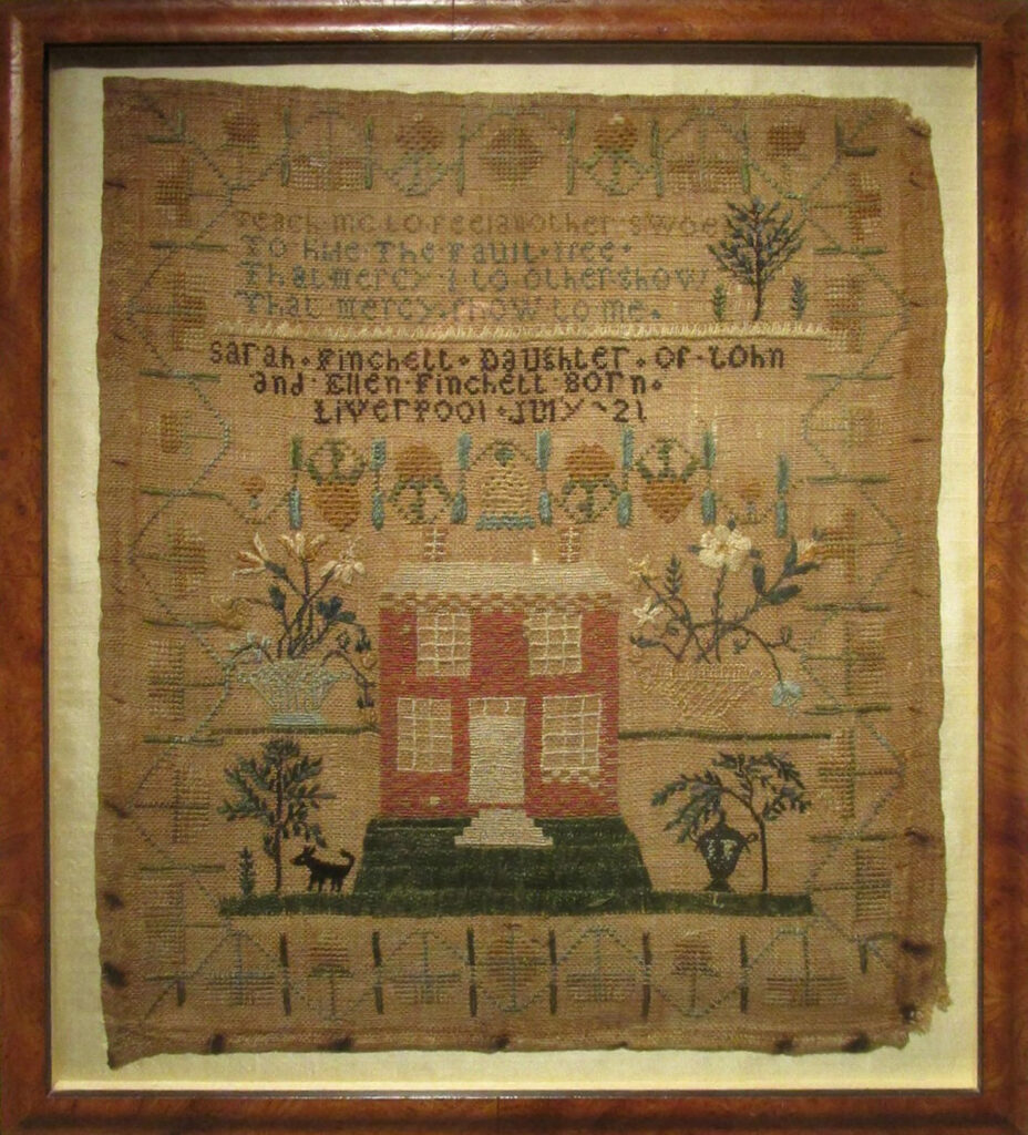 SARAH FINCHETT, circa 1810 The sampler is probably American, made in Liverpool (possibly New York) by the daughter of John and Ellen Finchett. On homespun linen, stitched with silk threads, a four sided floral border encloses a verse and a scene with a large brick house flanked by flowers, trees, a black dog,and a black…