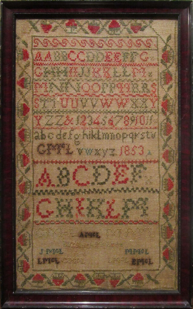 Elizabeth McLean 1853 Possibly Scottish sampler executed in wool and silk on homespun tammy (wool) cloth, consisting of a strawberry border surrounding an inner reserve with nine rows of alphabets and numerals, as well as groups of initials such as “MMcL” and “EMcL” presumably members of the McLean family. The primary colors used are red…