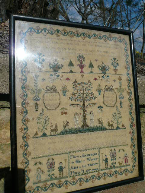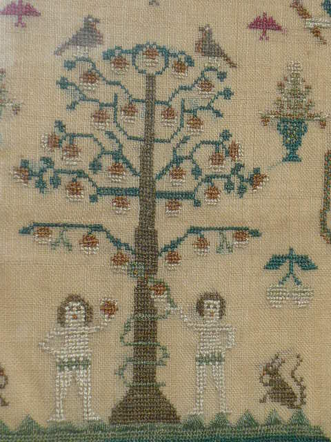 English pictorial sampler featuring Adam and Eve at the center surrounded by birds, squirrels, lions and cherubs, with two short verses: