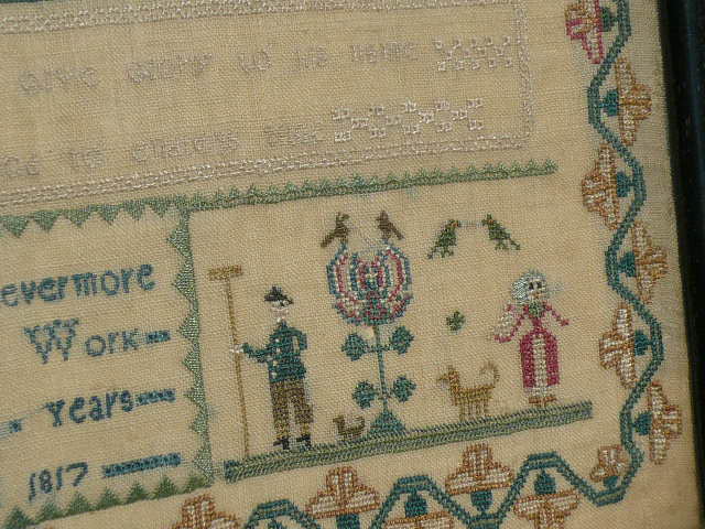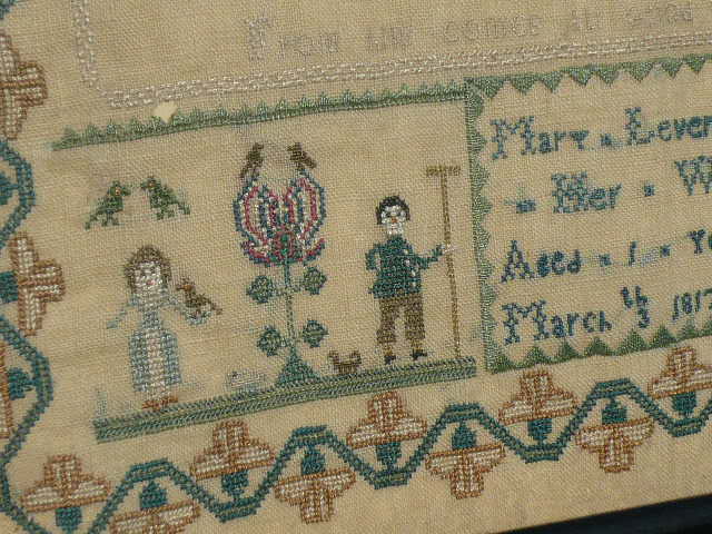 At the bottom there are two vignettes featuring farmers and their wives surrounded by a goat and chickens. The sampler is signed MARY LEVERMORE HER WORK AGED = 1 = YEARS MARCH THE 3 1817