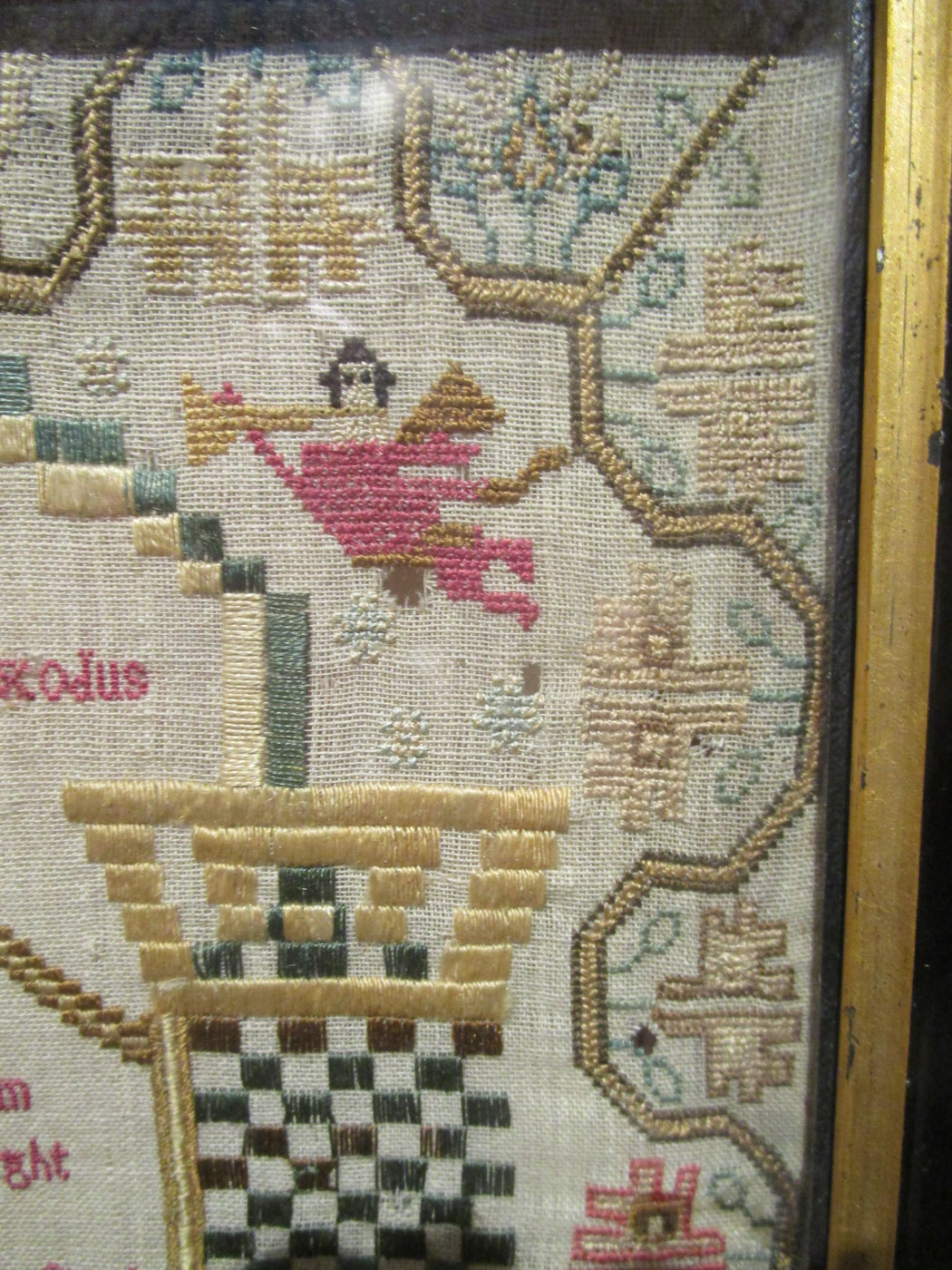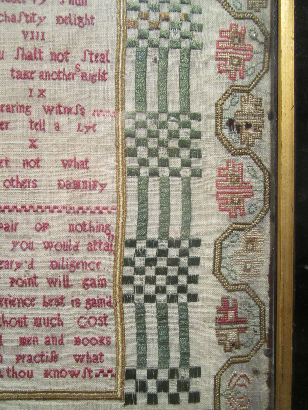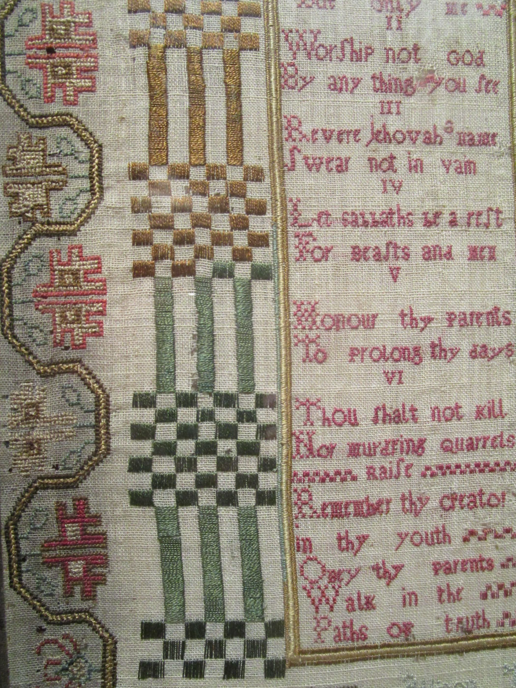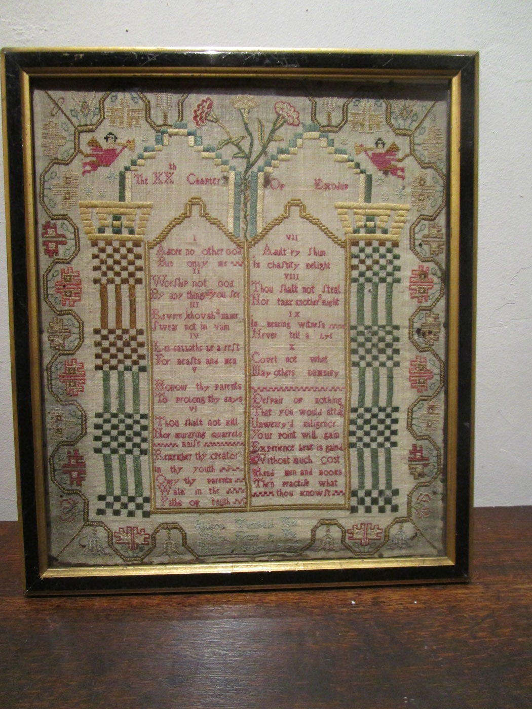 Beautifully stitched English sampler with a four sided floral pansy and carnation border centering tablets inscribed with the Ten Commandments and a pious verse with satin stitches columns on either side and trumpeting angels in the upper left and right corners above the columns. Stitches used include cross, petit point, counted satin, split, and freehand stem.
