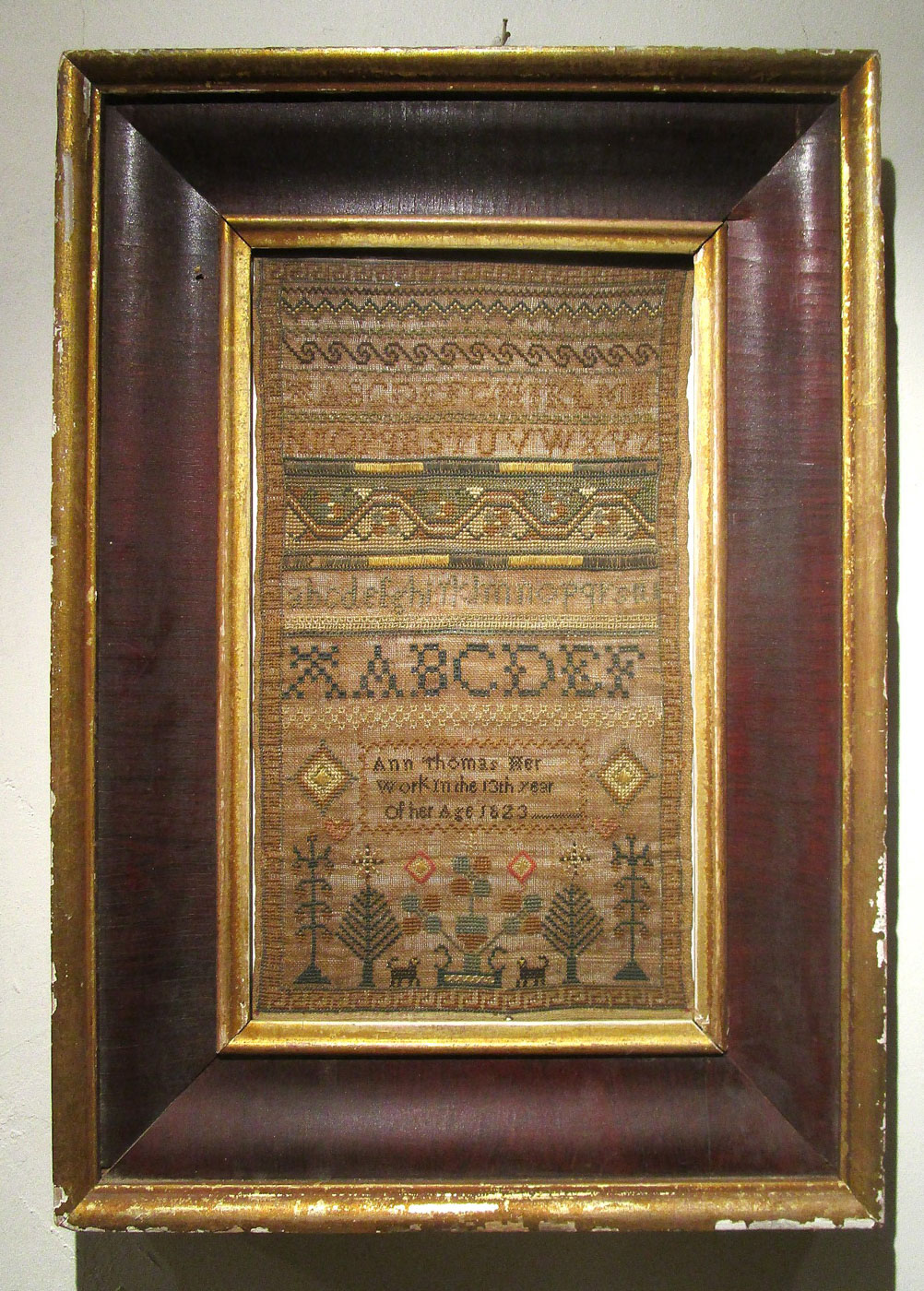 The color and condition are very good to excellent (no holes) and it is framed in what is likely the original frame. The frame has some losses to the gilding around the outer right, left, and lower edges. The sampler measures 10″ x 17″, with the frame the measurements are 17-3/4″ x 25″