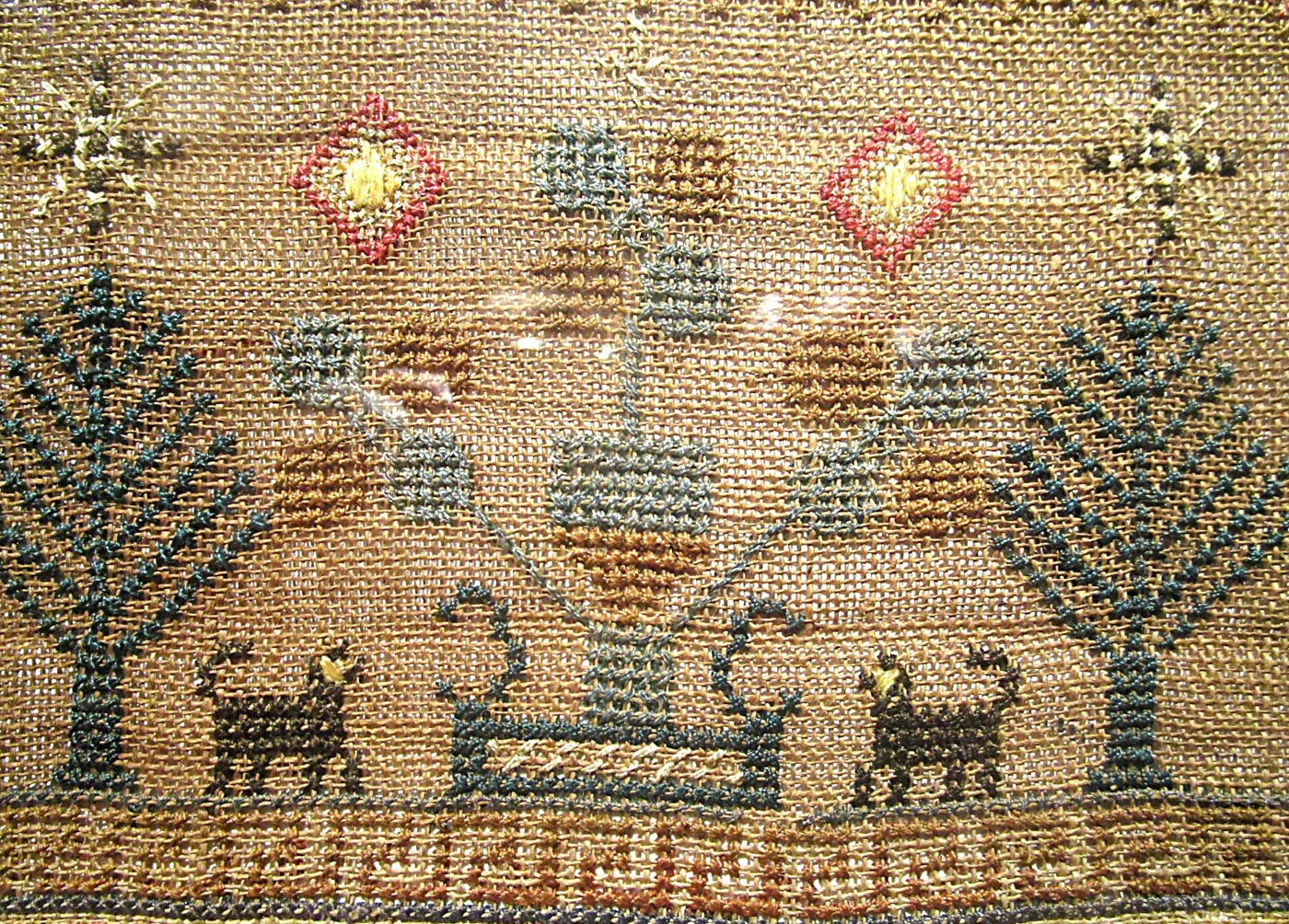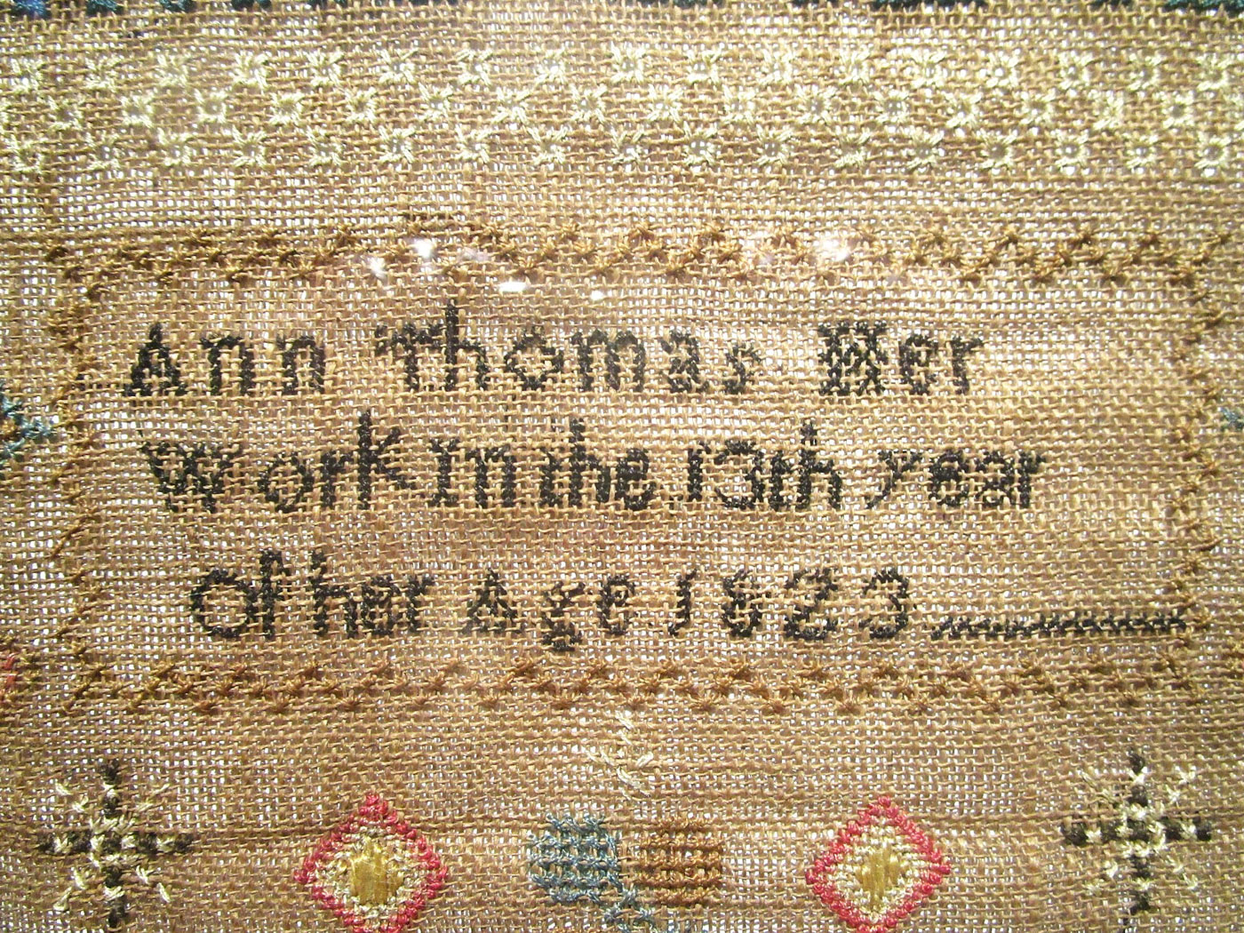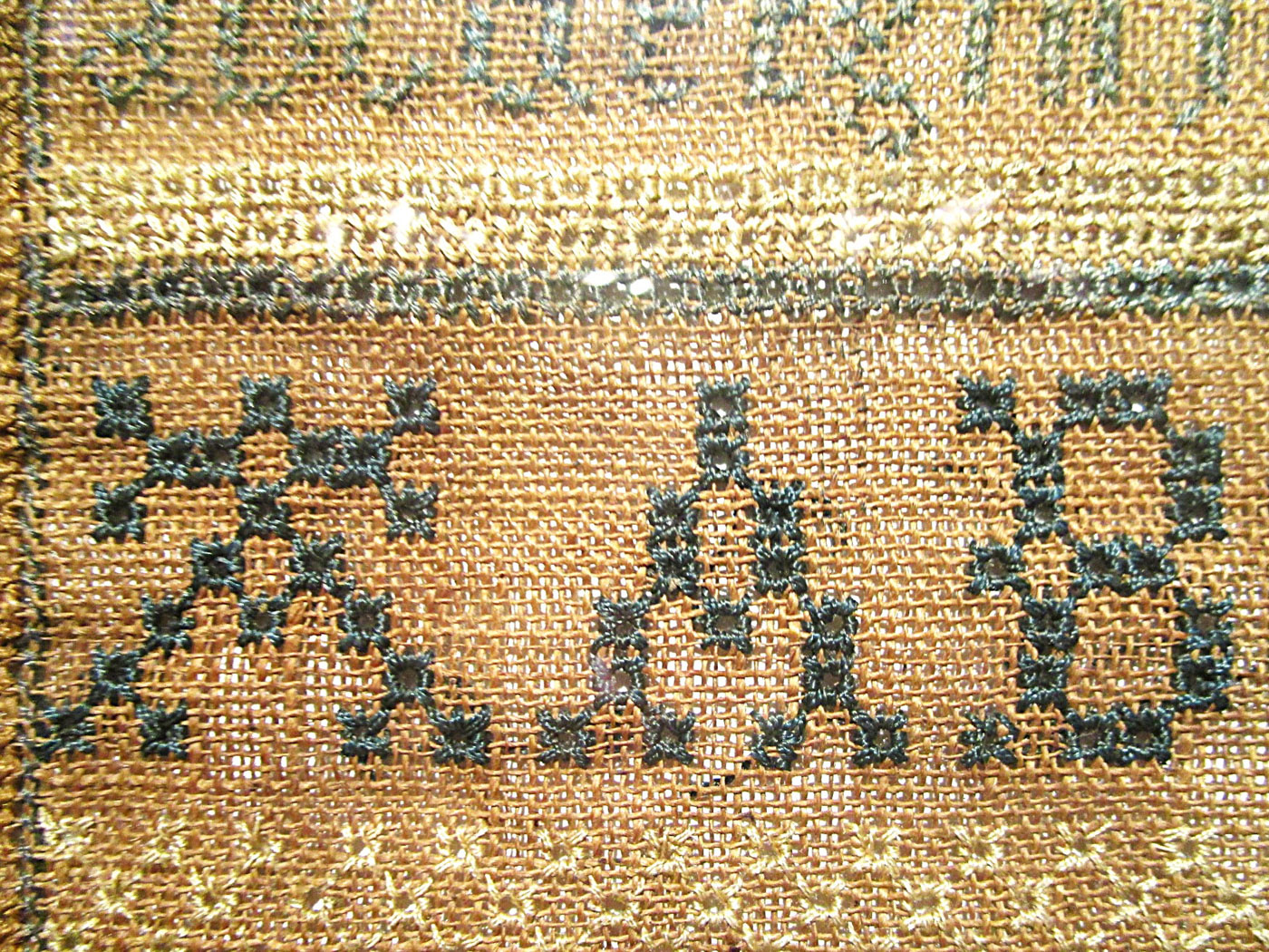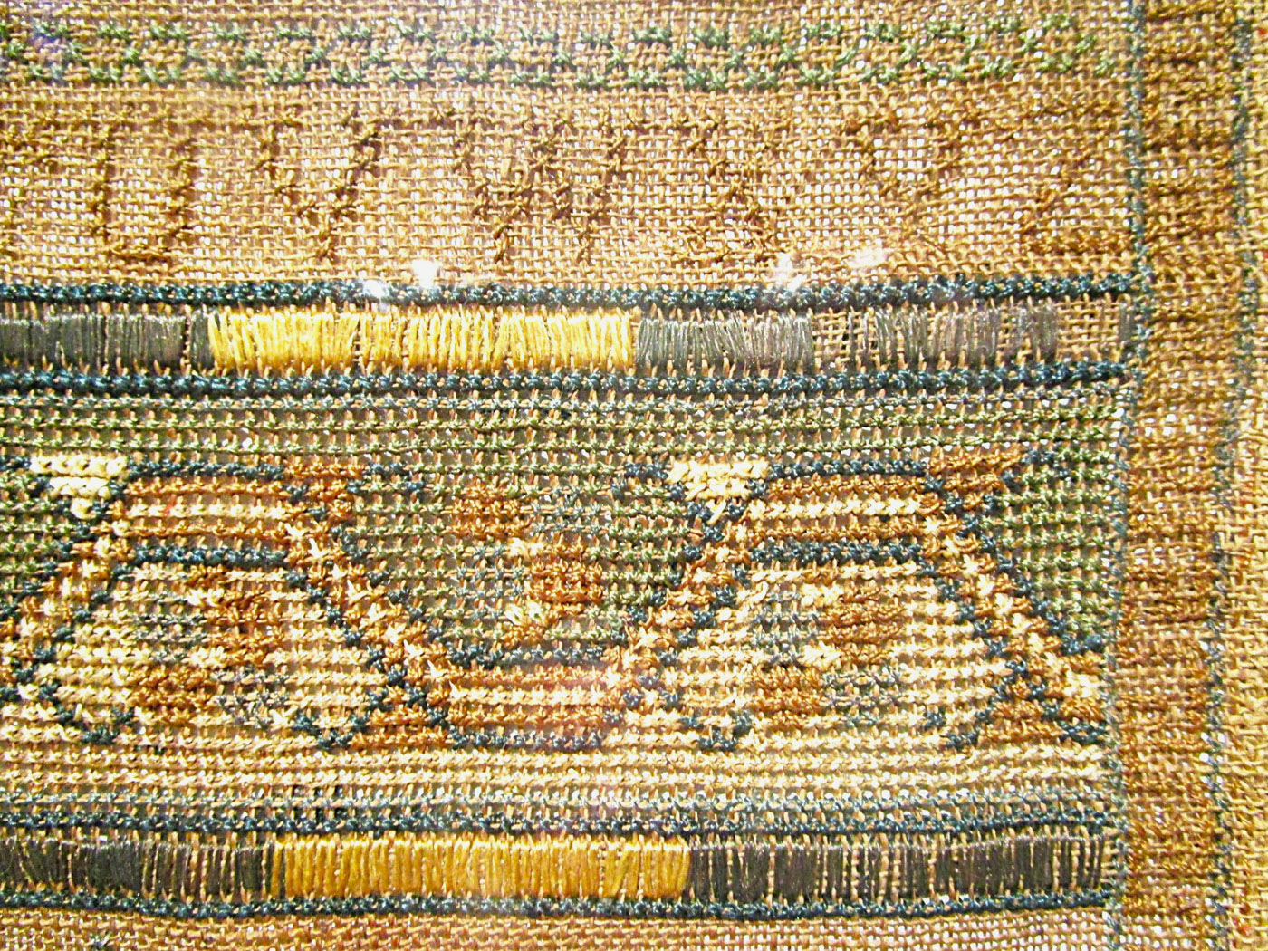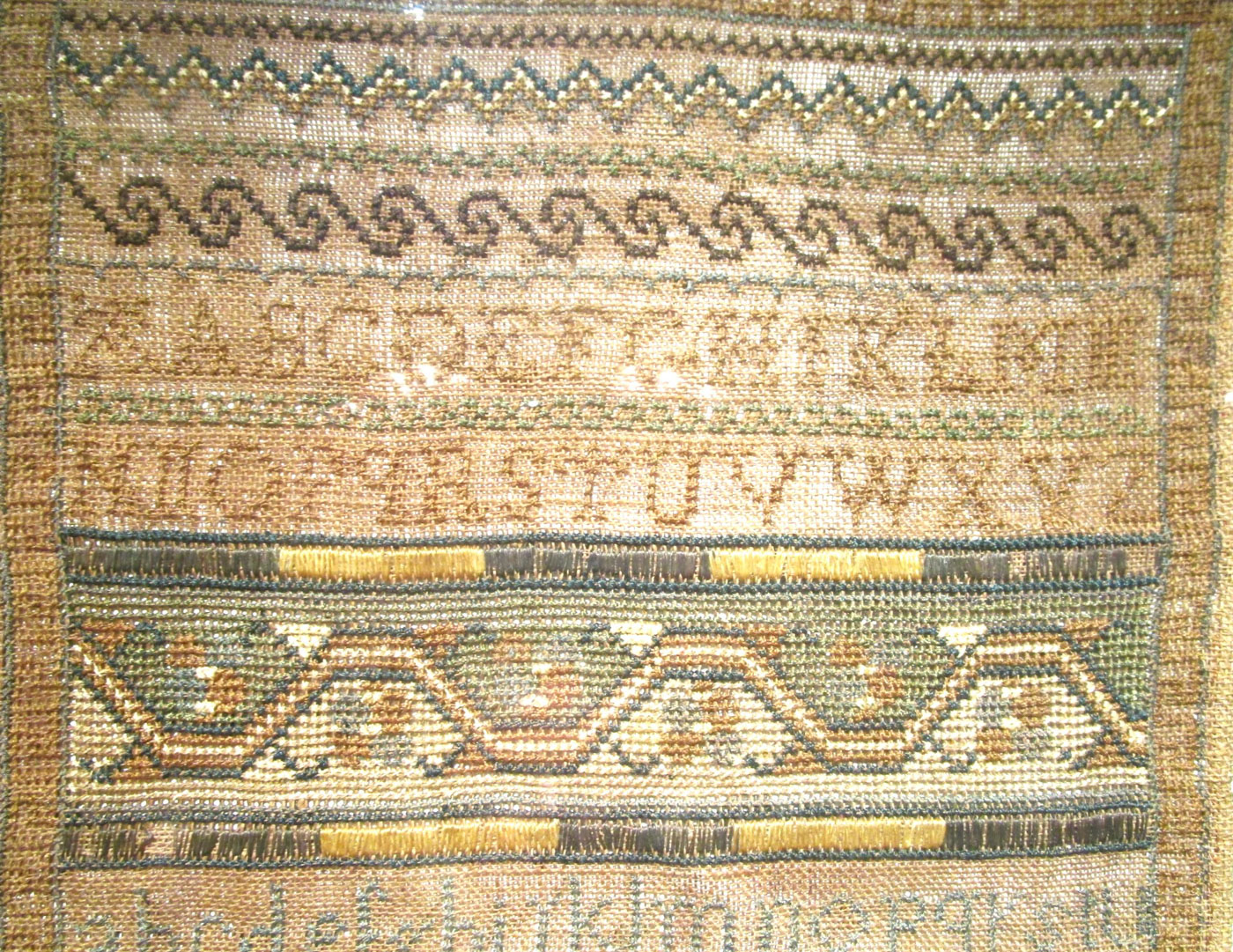 An American sampler stitched with silk thread on homespun linen with cross, eyelet, petit point and counted satin stitches, with a four sided Greek key border and various horizontal geometric pattern bands and alphabets.