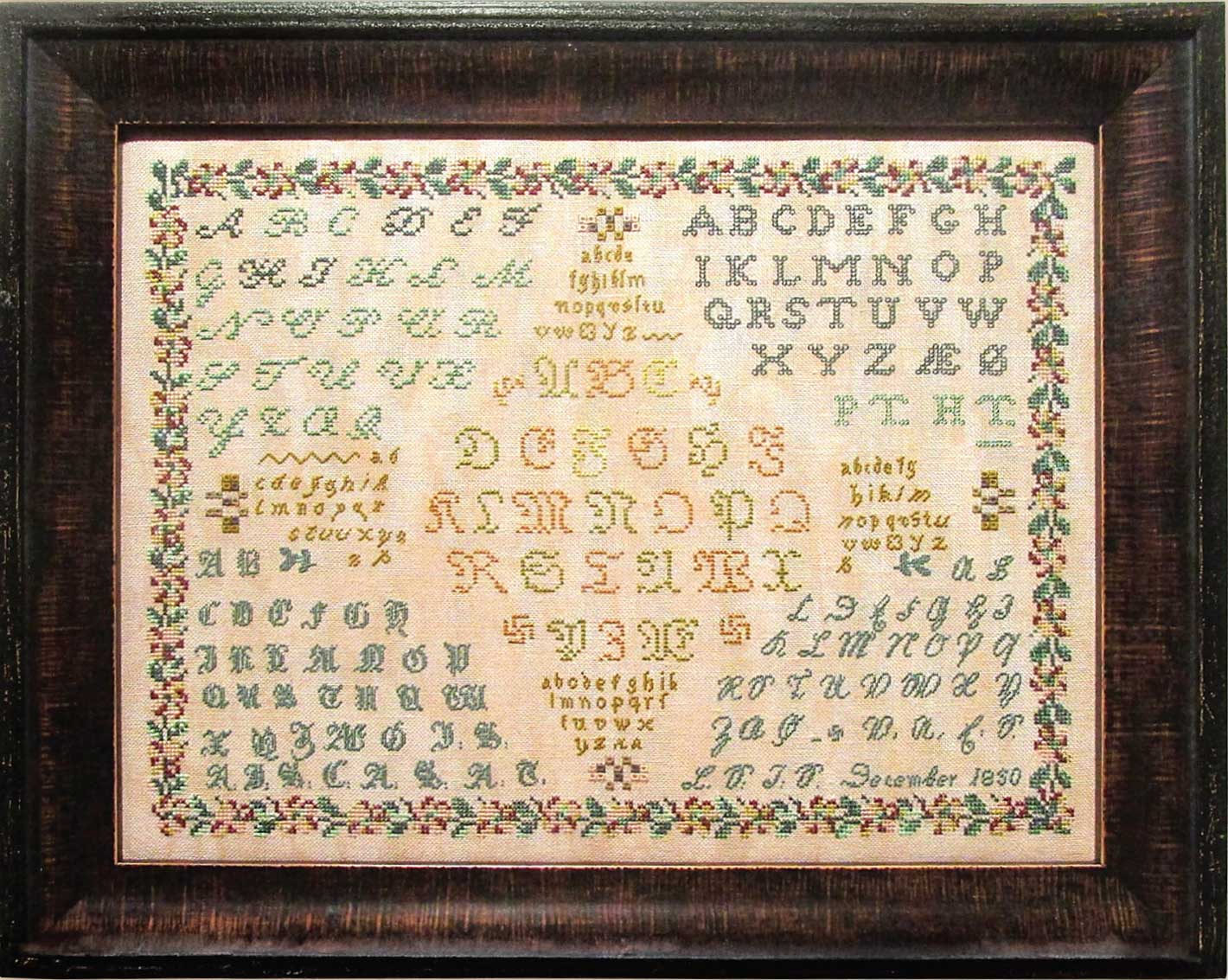 On 32 count linen the reproduction will most closely approximate the size of the original sampler: 13 1⁄2” x 10”, and the project is recommended for any level of skill.