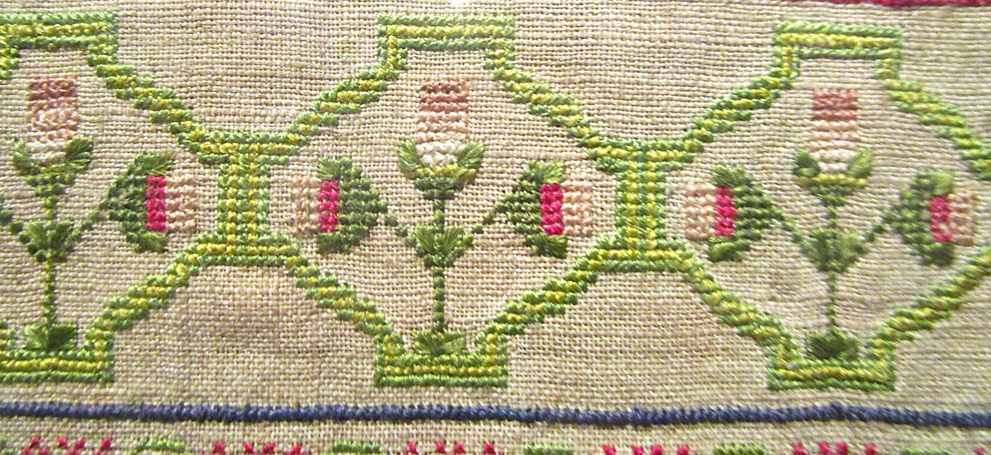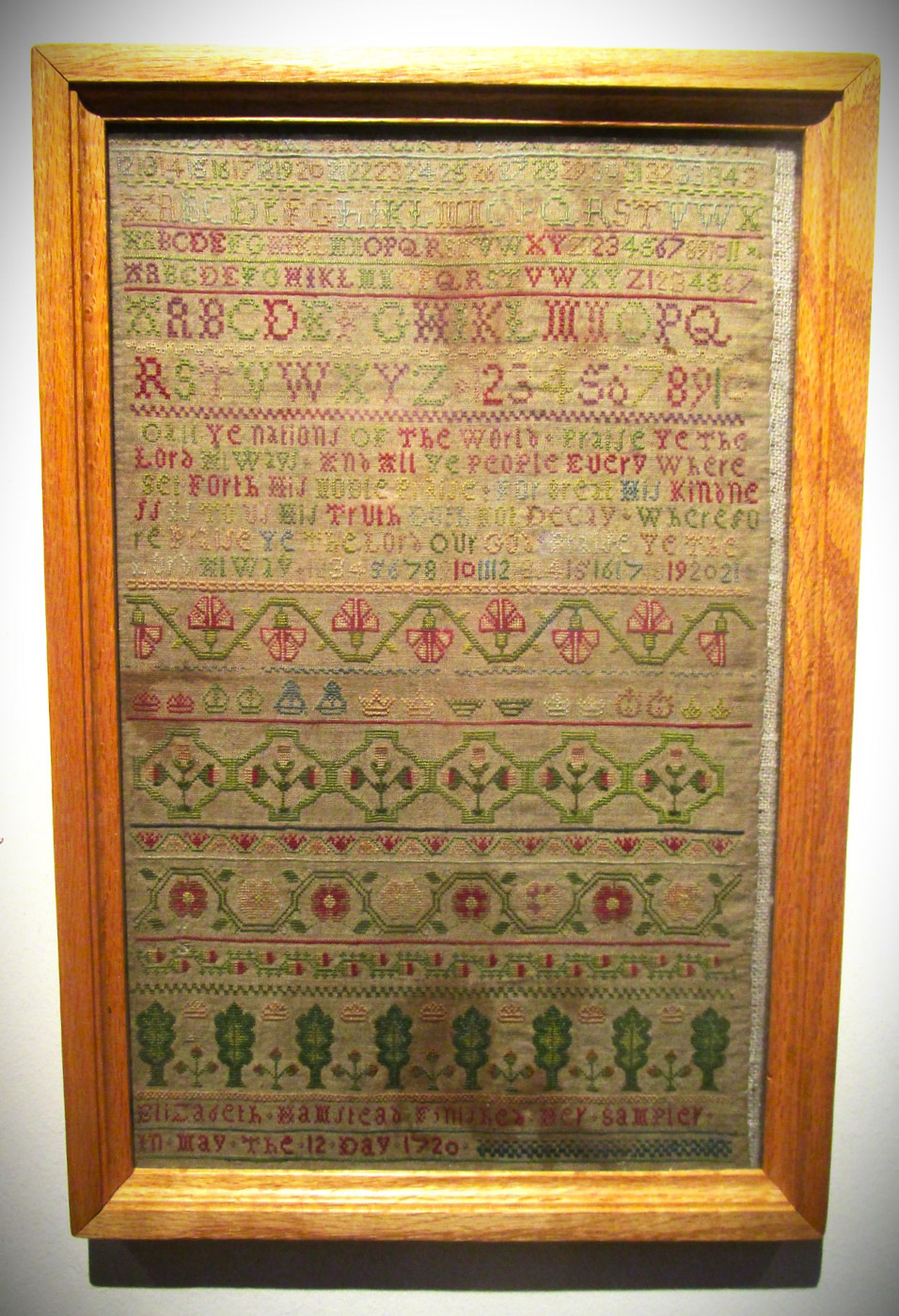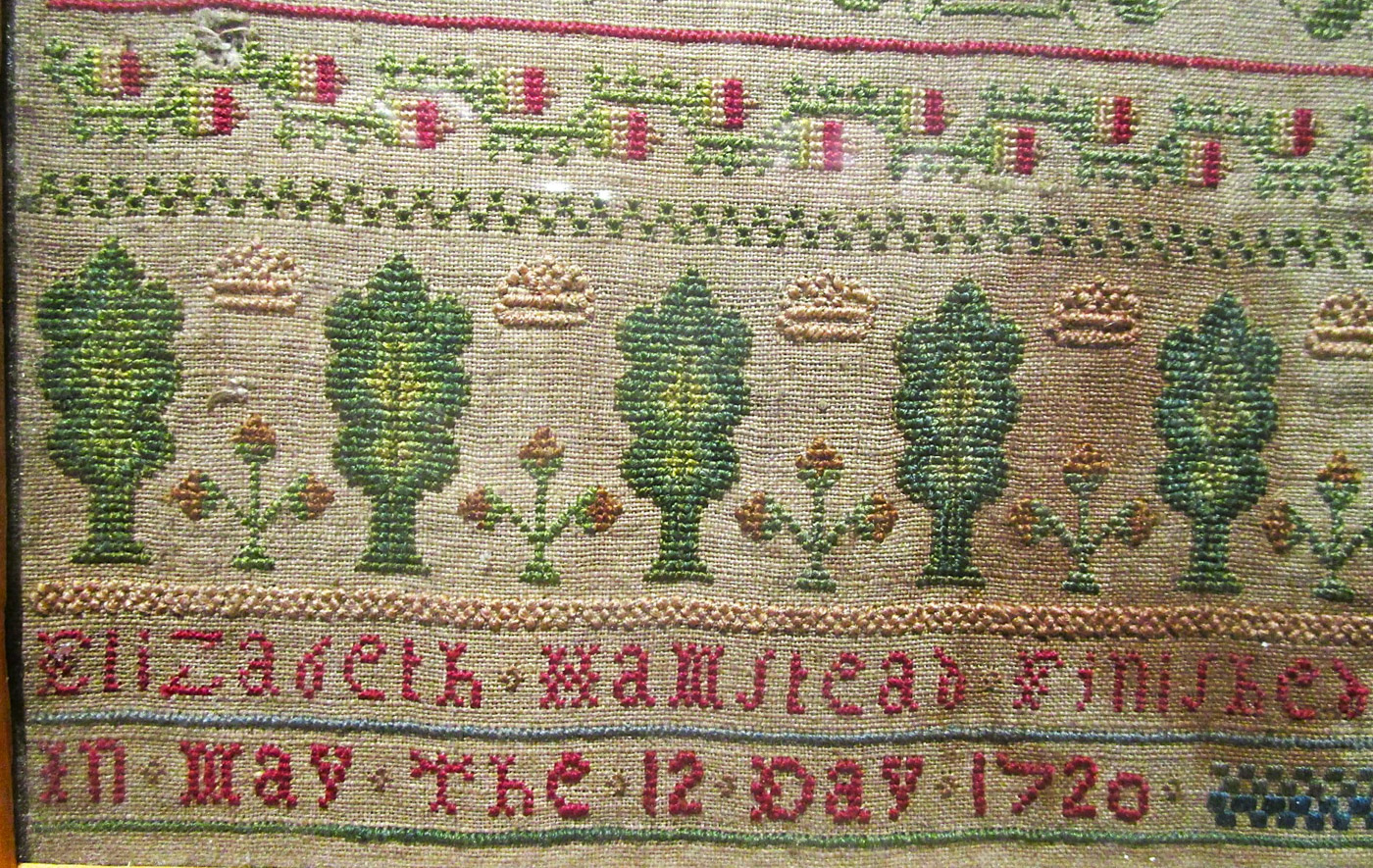 English sampler very finely stitched with silk threads on a linen ground, consisting of seven rows of alphabet and numerals, a six line pious verse and seven rows of assorted floral pattern bands. At the bottom, above the attribution and date, is a row of unusual stylized trees interspersed with crowns. Stitches used in the sampler are cross, counted satin and eyelet. It is in very good condition, very good color, with some minor staining and one small hole at the left of the sixth pattern band. The sampler has been mounted over linen in a modern frame. 14″ x 9. The verse is:
