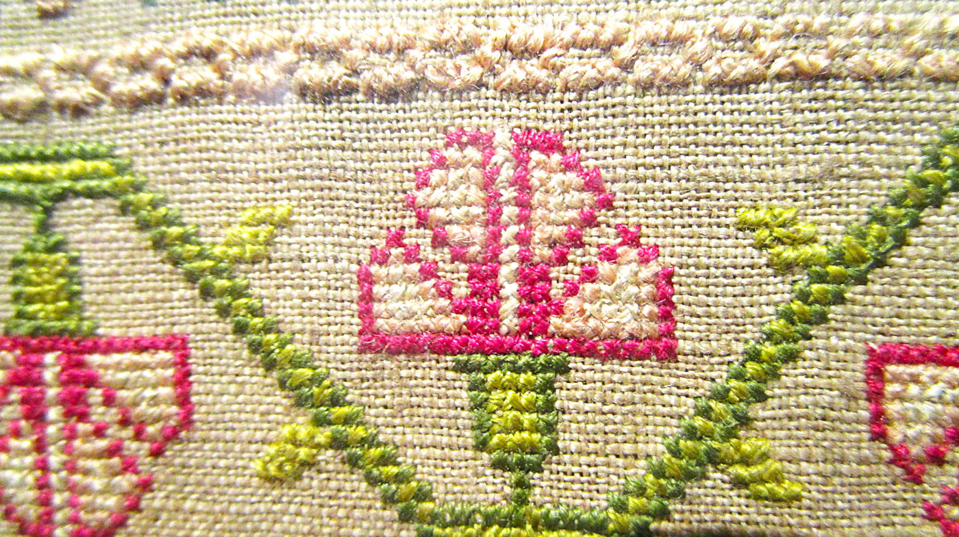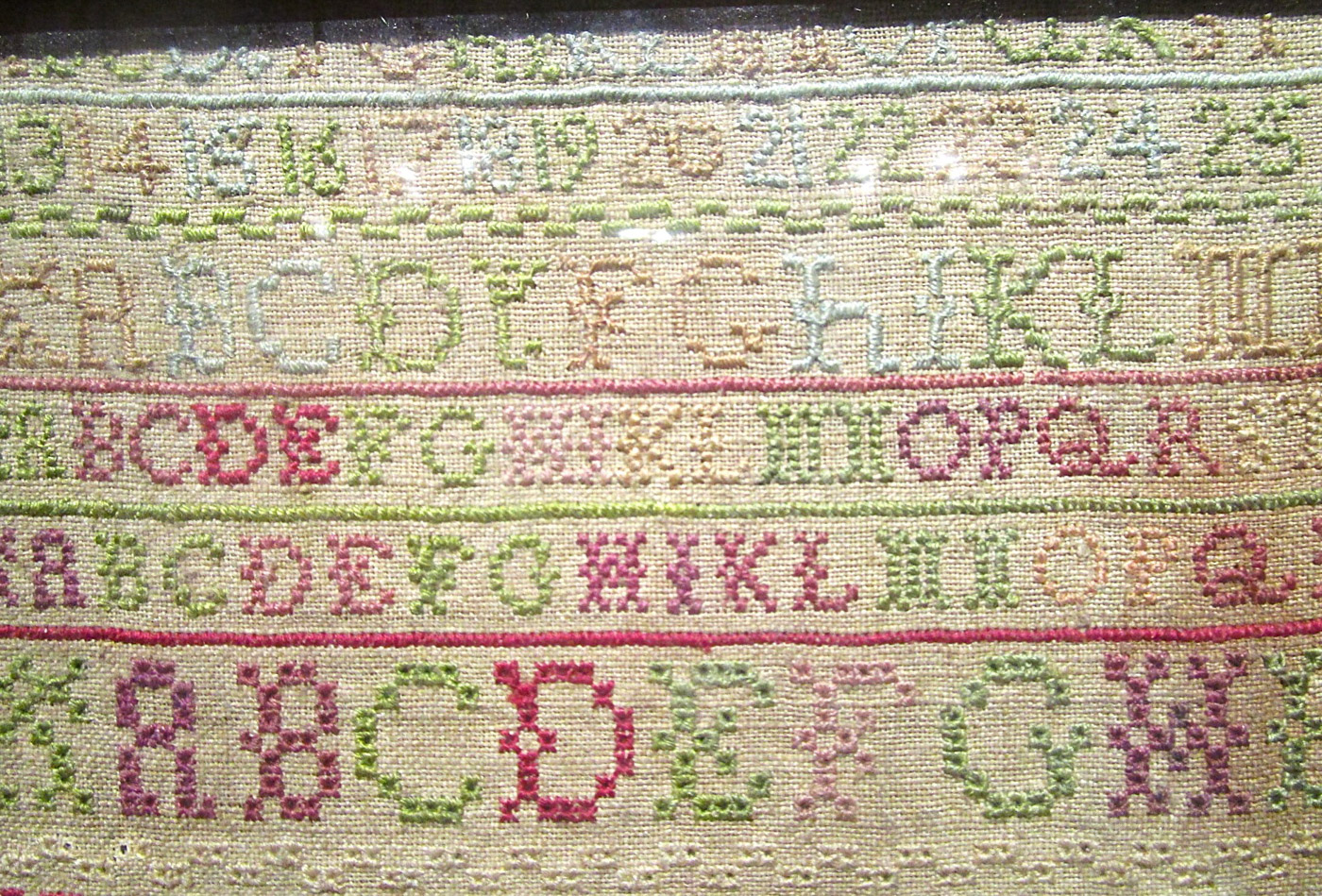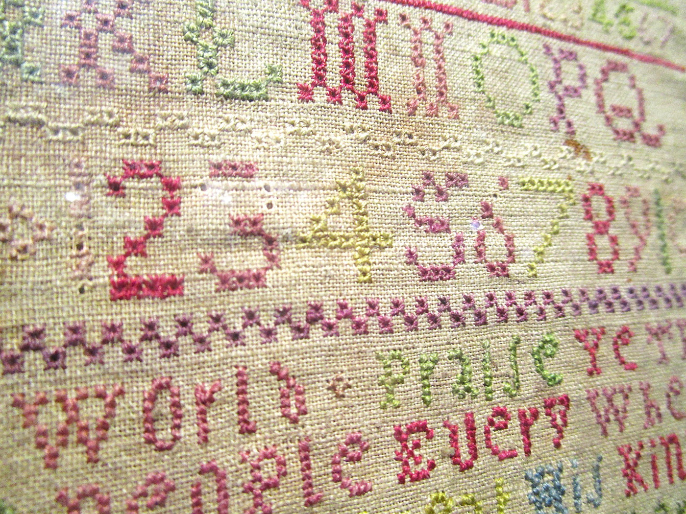 English sampler very finely stitched with silk threads on a linen ground, consisting of seven rows of alphabet and numerals, a six line pious verse and seven rows of assorted floral pattern bands. At the bottom, above the attribution and date, is a row of unusual stylized trees interspersed with crowns. Stitches used in the sampler are cross, counted satin and eyelet. It is in very good condition, very good color, with some minor staining and one small hole at the left of the sixth pattern band. The sampler has been mounted over linen in a modern frame. 14″ x 9. The verse is: