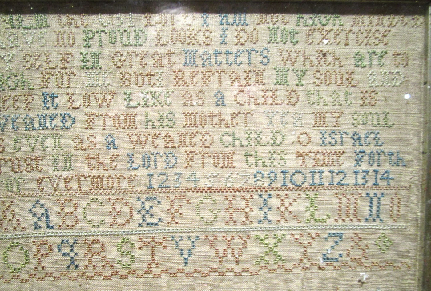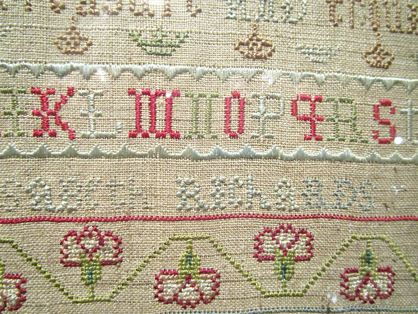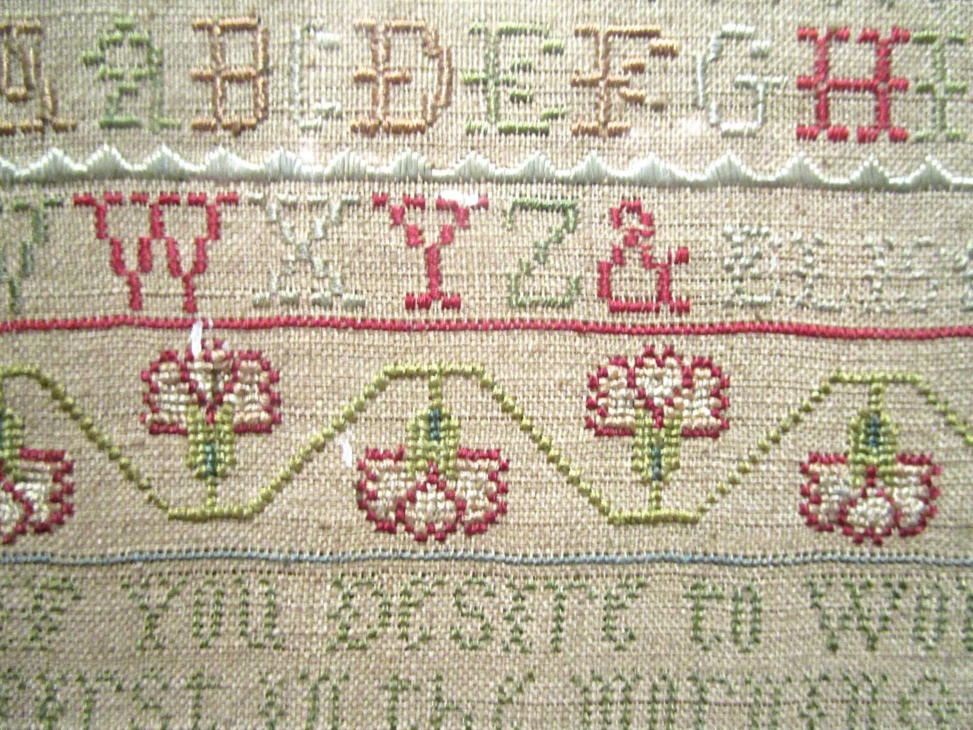 Stitches used are cross, counted and freehand satin, stem and eyelets. Excellent color and condition, in a 20th century frame. 8-3/4″ x 18-3/4″ sampler itself, with the frame 10-1/2″ x 20-1/2″