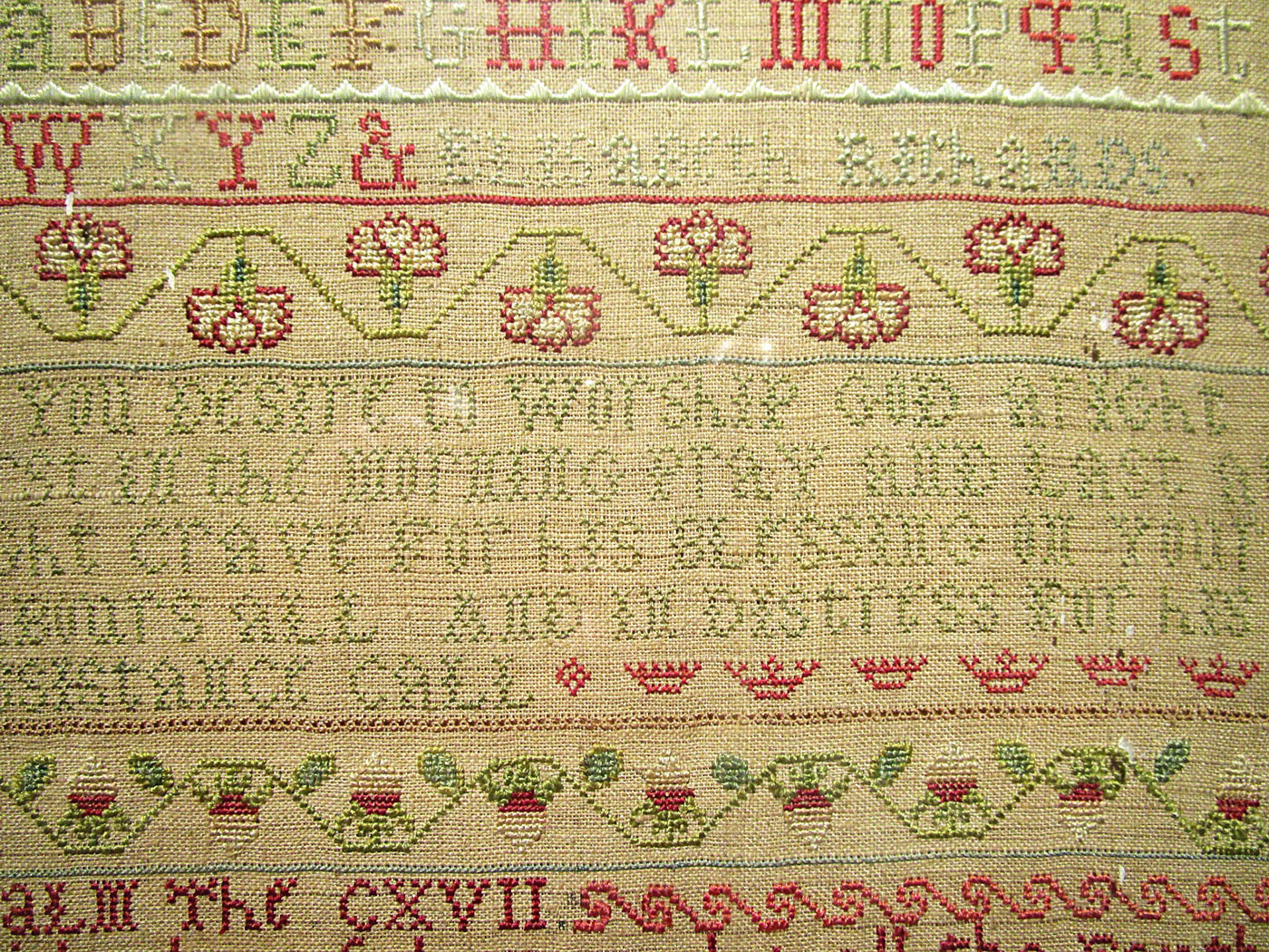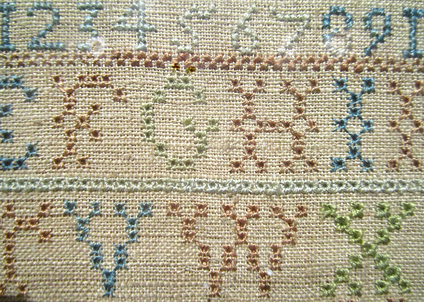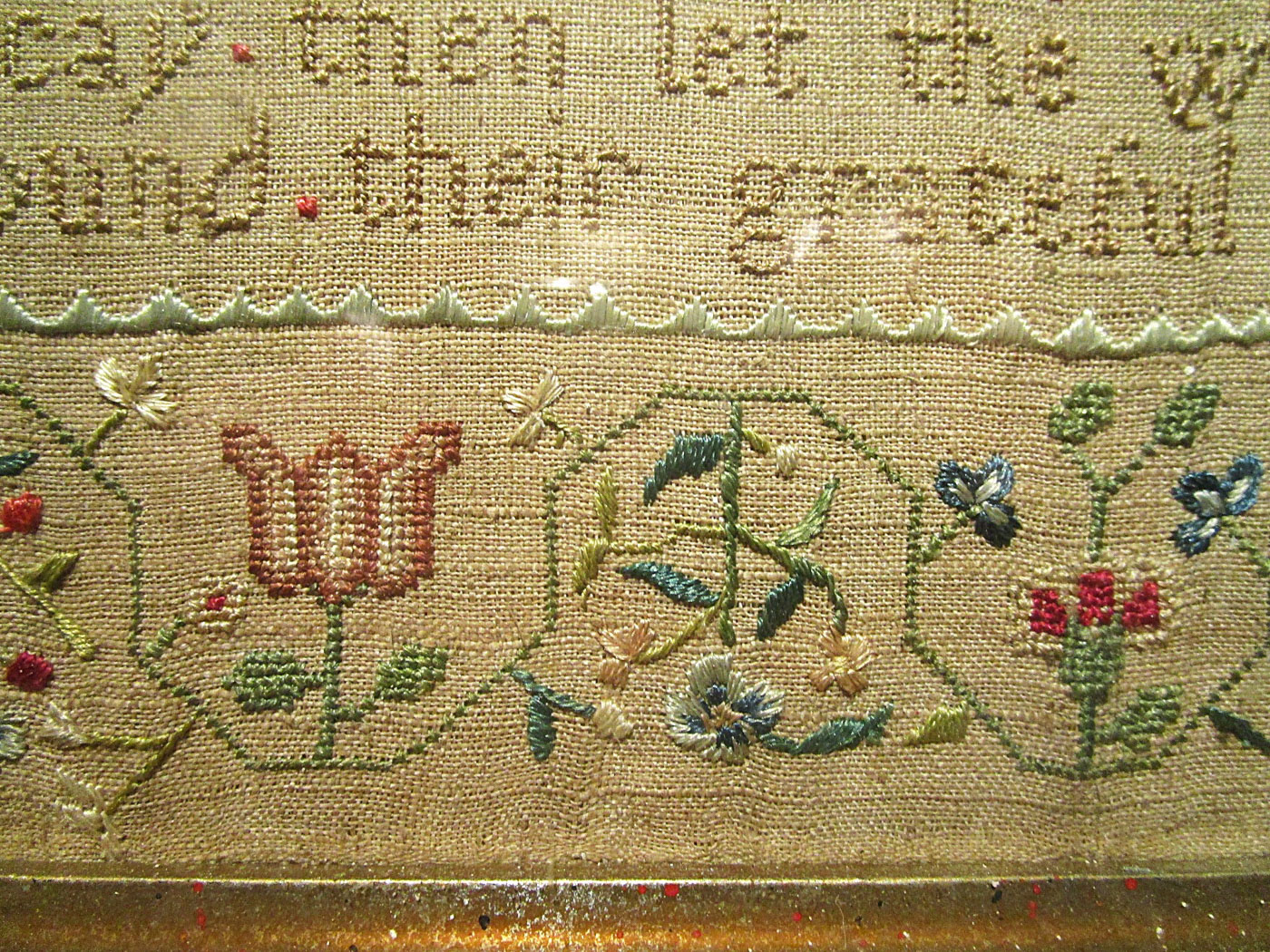 Stitches used are cross, counted and freehand satin, stem and eyelets. Excellent color and condition, in a 20th century frame. 8-3/4″ x 18-3/4″ sampler itself, with the frame 10-1/2″ x 20-1/2″