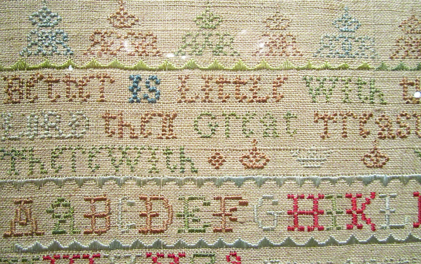 Beautifully and finely executed English band sampler stitched with silk on fine linen featuring four pious verses as well as two alphabets and horizontal floral and crown bands. A lovely colorful floral band stretches across the bottom.