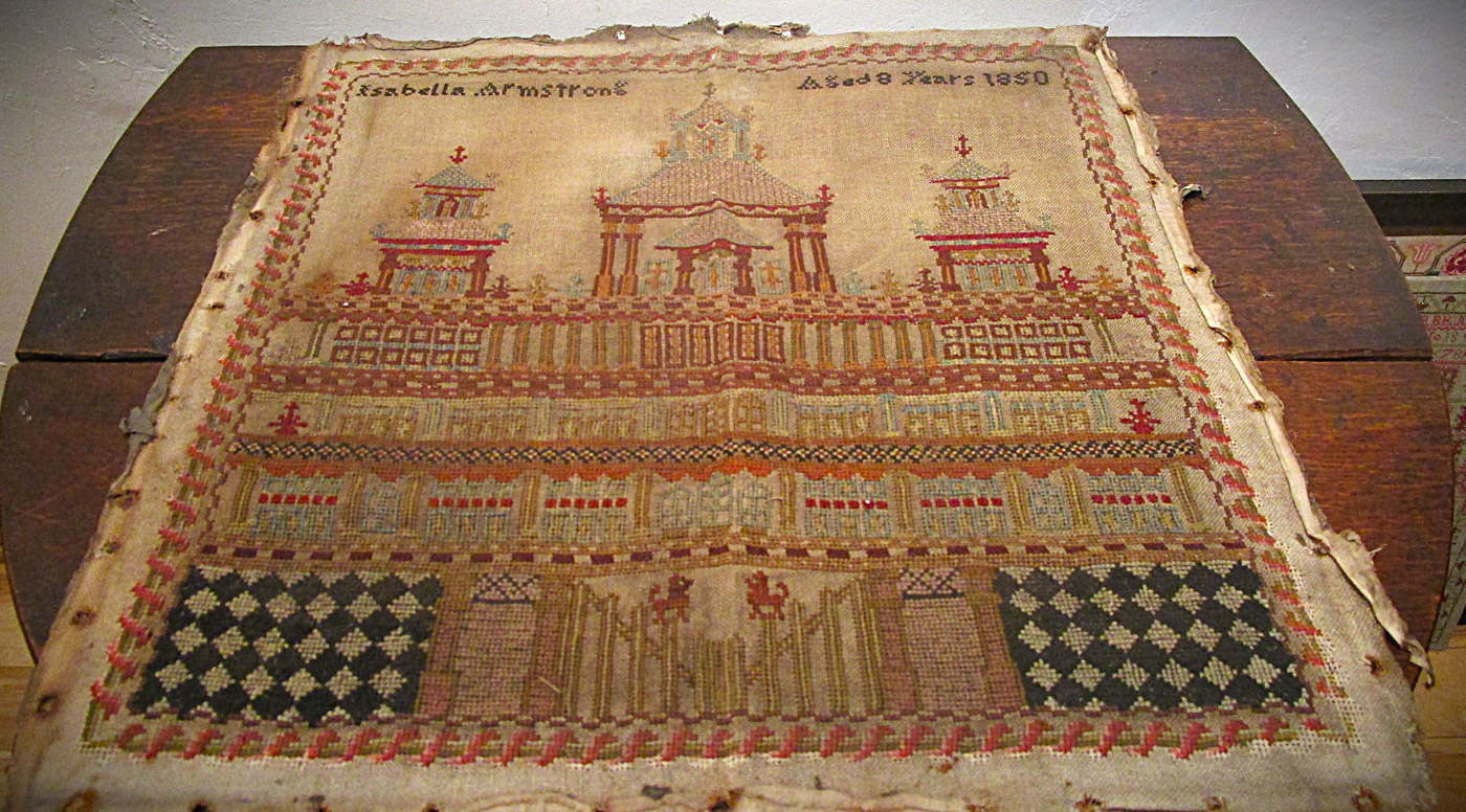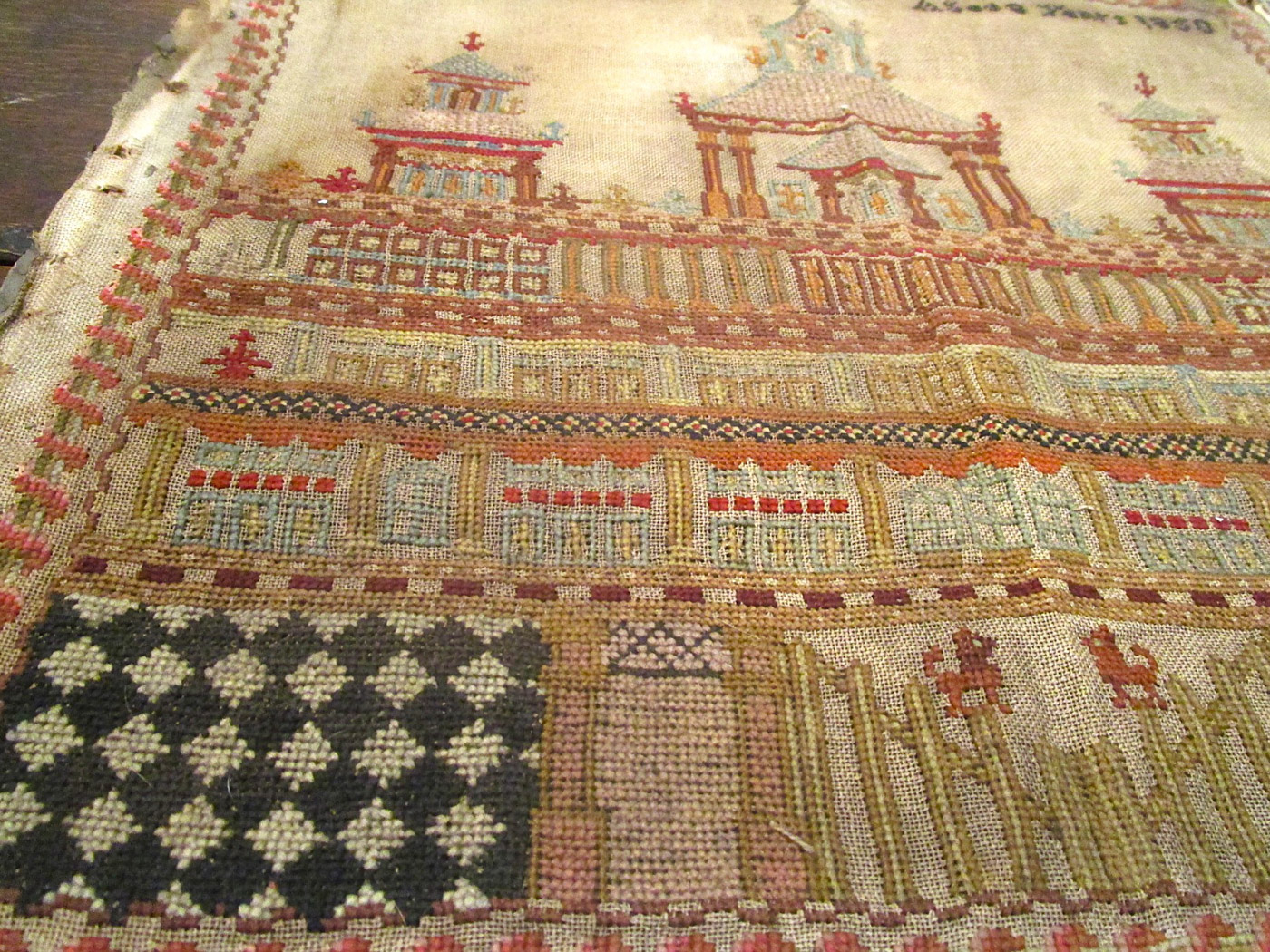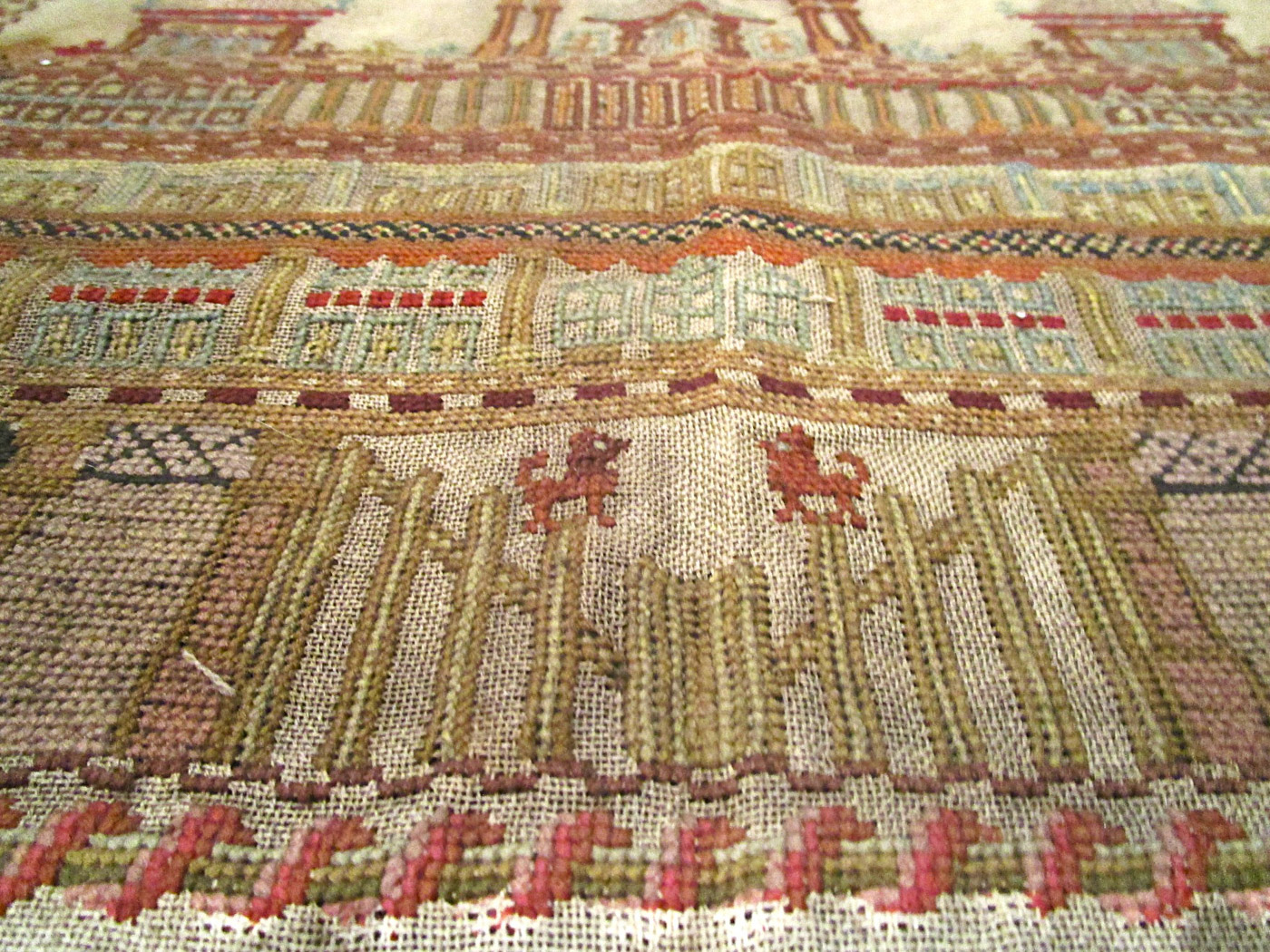 English sampler featuring a very large rendition of Solomon’s Temple, fronted by gates topped with lions and geometric patterns. It has been stitched with wool on linen with a four sided border.