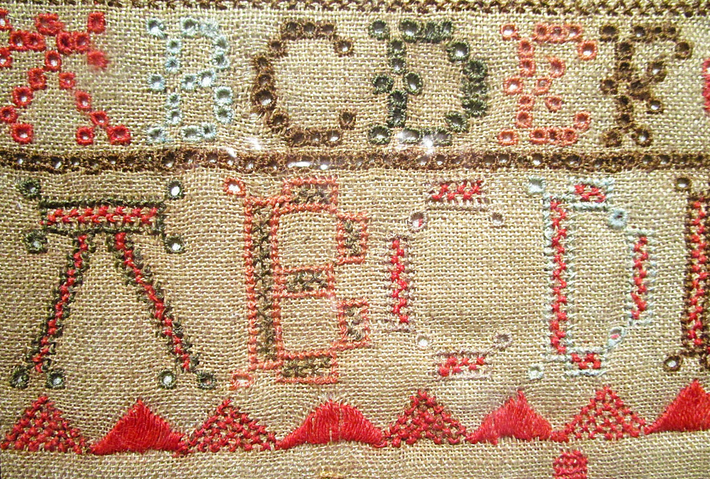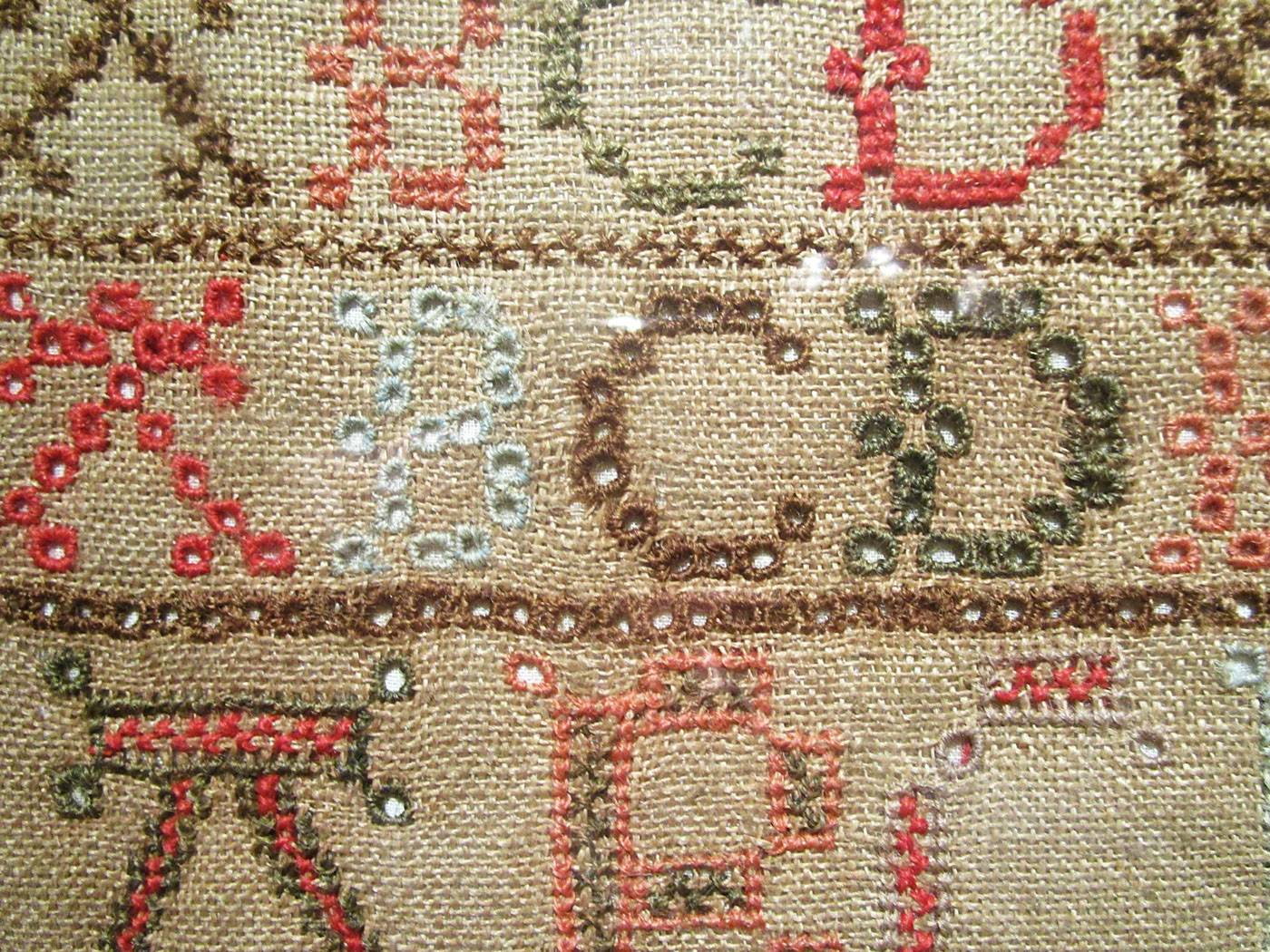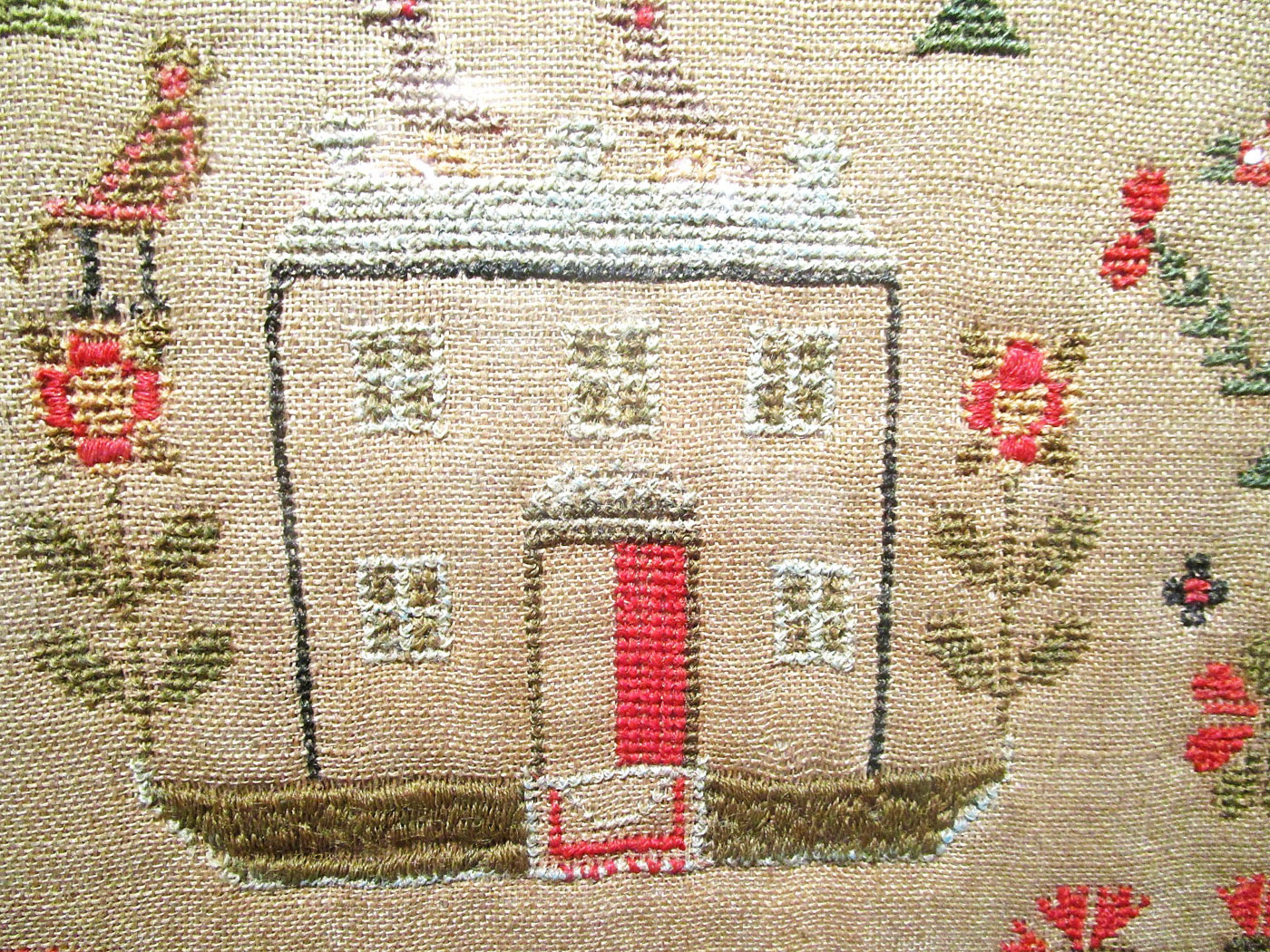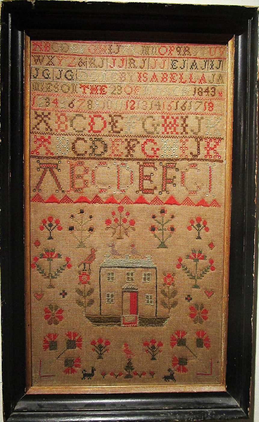 This Scottish sampler has been stitched with wool threads on a linen ground in a variety of stitches including cross, satin, eyelet, and buttonhole. Two doves perch atop a simple house in the lower half. Stylized alphabets, numerals and family initials cover the top half. The deep shadow box frame, in fair condition, could be original.
