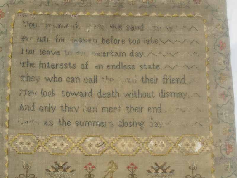 This lovely little sampler comes from the collection of the Metropolitan Museum of Art and has been cleaned and conserved by their staff. Stitches used are cross and counted satin.The verse can be mostly read:
